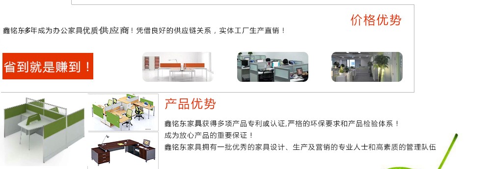 深圳市鑫銘東家具有限公司專業(yè)銷售各類辦公家具!產品涉及多種系列,如:班臺、班椅、屏風、會議桌、會議椅、辦公沙發(fā)、茶幾、辦公桌、文件柜、電腦桌椅、各式餐臺、餐椅、書柜等辦公家具。 鑫銘東家具擁有一批優(yōu)秀的家具設計、生產及營銷的專業(yè)人士和高素質的管理隊伍。銘東家具以"先難后易"之戰(zhàn)略,在產品結構、產品質量及服務水平方面,均推陳出新,力求完善,精益求精。使我們的產品質量保持在國內外家具潮流的先進水平,力求滿足客戶的特殊需求。鑫銘東家具多年來致力于環(huán)保、實用家具的設計與開發(fā),集生產、銷售、服務于一體。本著"以人為本"的設計理念,大量開發(fā)符合人體工程學的各種產品,以"誠信為本"的質量方針,真材實料,認認真真做產品,實實在在做人。鑫銘東家具更致力于創(chuàng)造"零維修率"的制造境界,實現"沒有維修的服務才是最好服務"的口號》了解更多